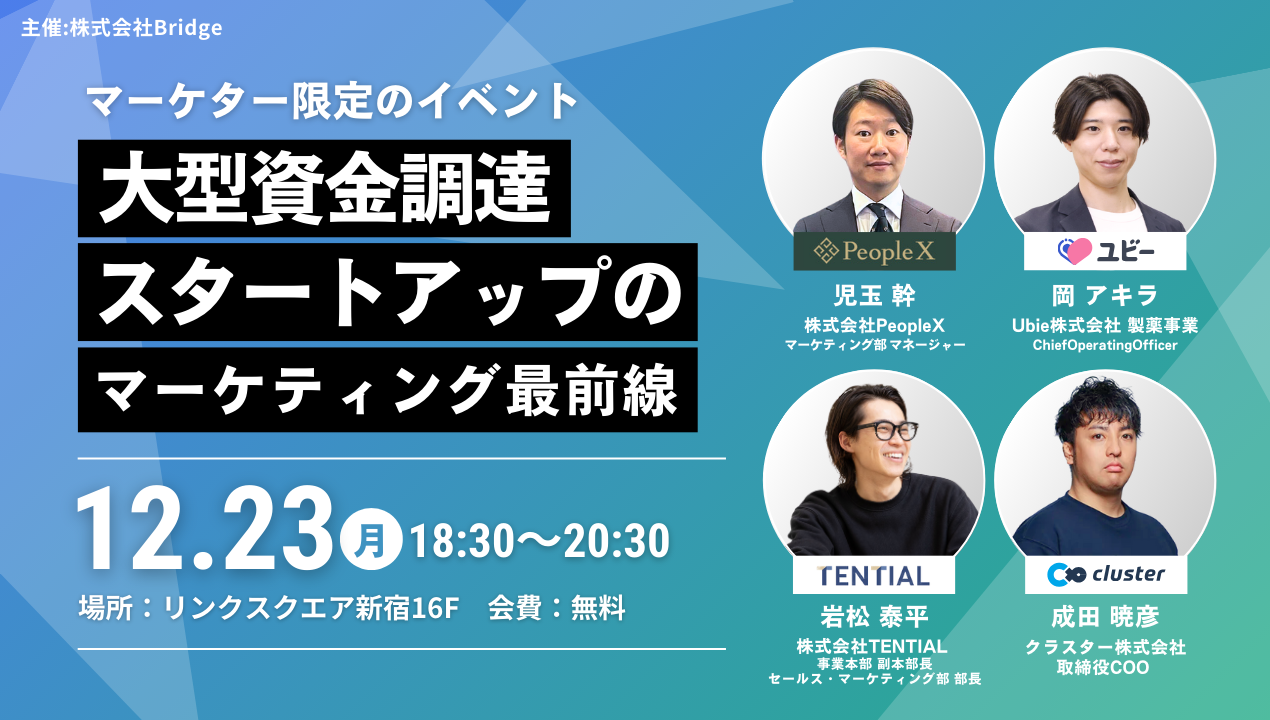 こんにちは!Bridgeでイベントを担当している松本です。12/23(月)に開催された「大型資金調達スタートアップのマーケティング最前線」のイベントの様子をお届けします!