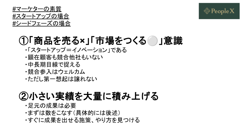 児玉さんはスタートアップの初期段階のマーケターの素質に必要なことは2つあるとおっしゃっていました。