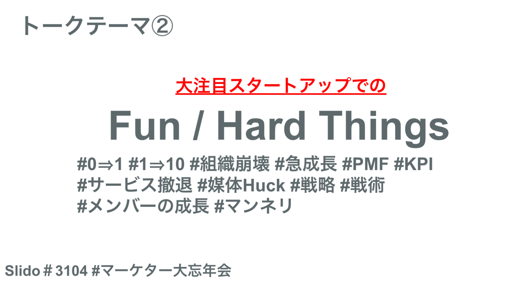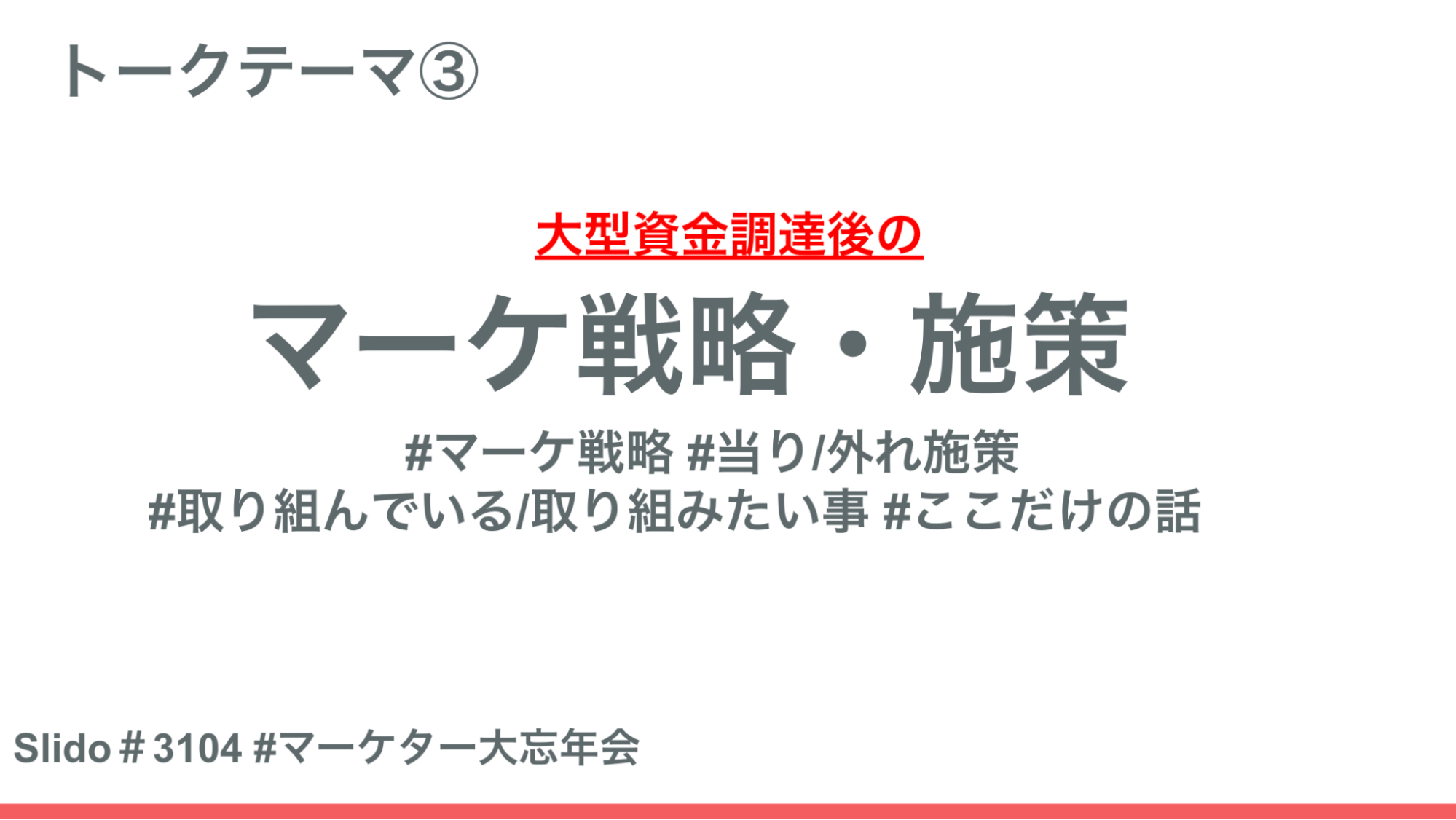 最後は今イベントの肝テーマ、大型資金調達後のマーケ戦略・施策のトピックです。