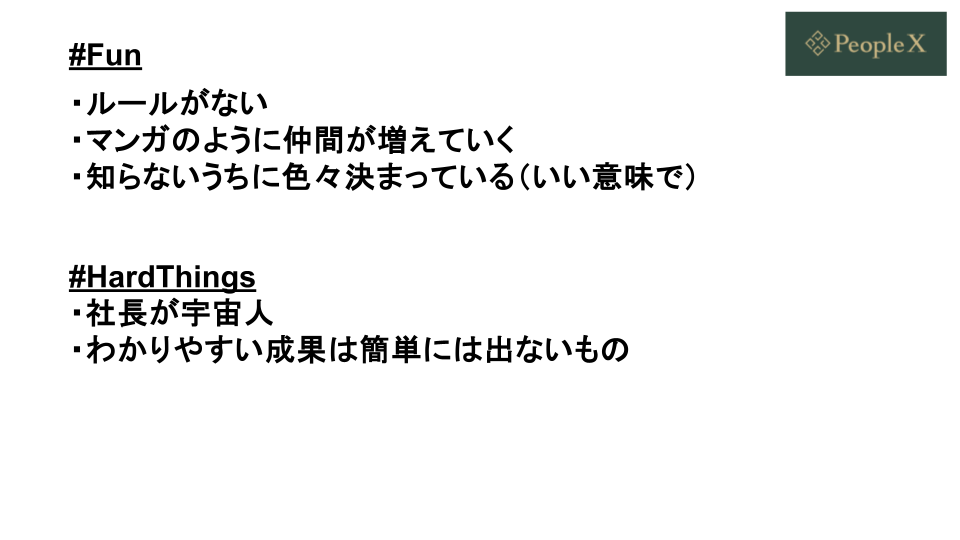 ハードシングスとしては、入社した週に会社のキャッシュがなくなる状況だったことです。全社員で必死に営業してなんとか乗り越えられたそうです。
