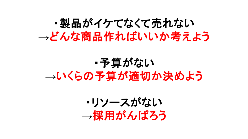 例えば製品がイケてない、予算がない、リソースがない等。そんな状況でも、言い訳するのではなくそれならどんな商品を作るべきか、いくらの予算が適切なのか、採用を頑張る等出来る事をやっていくべきと言っていました。