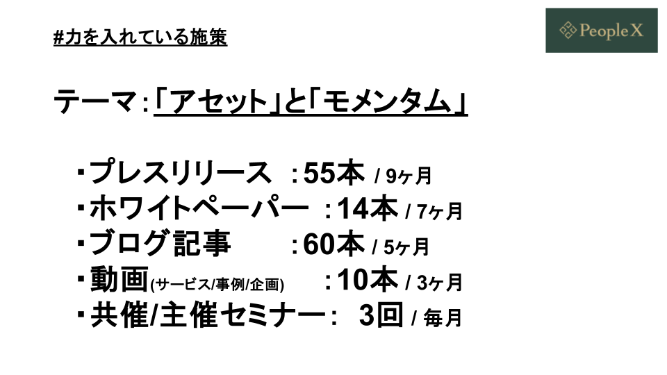 PeopleXは、立ち上がったばかりという事もありコンテンツに力を入れているようです。「アセット」と「モメンタム」をテーマに、膨大な量のプレスリリースを発信、他にもホワイトペーパー、ブログ等様々な施策を実行しています。