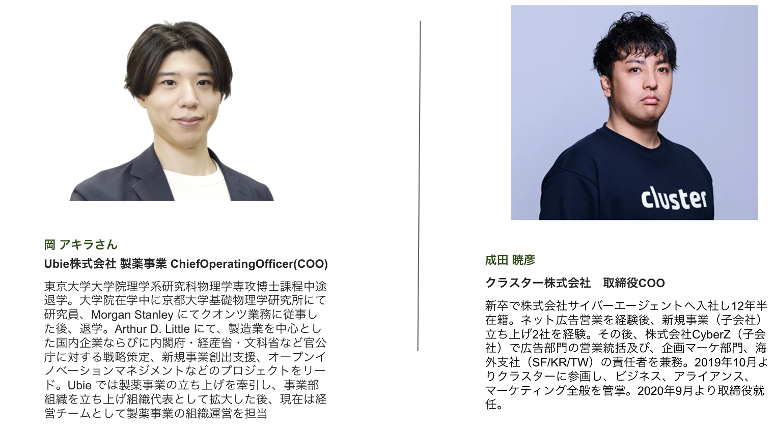 創業わずか1年で既に2つのプロダクトをリリースする株式会社PeopleXのマーケティングマネージャー児玉幹さん、「テクノロジーで人々を適切な医療に案内する」をミッションに3つの事業を展開している株式会社Ubieの岡アキラさん、コンディショニングを支える製品を次々と生み出している株式会社TENTIALの事業本部 副本部長 兼 セールス・マーケティング部 部長 岩松泰平さん、国内最大級のメタバースプラットフォーム「cluster」を運営するクラスター株式会社取締役COO成田暁彦さんに登壇いただきました。