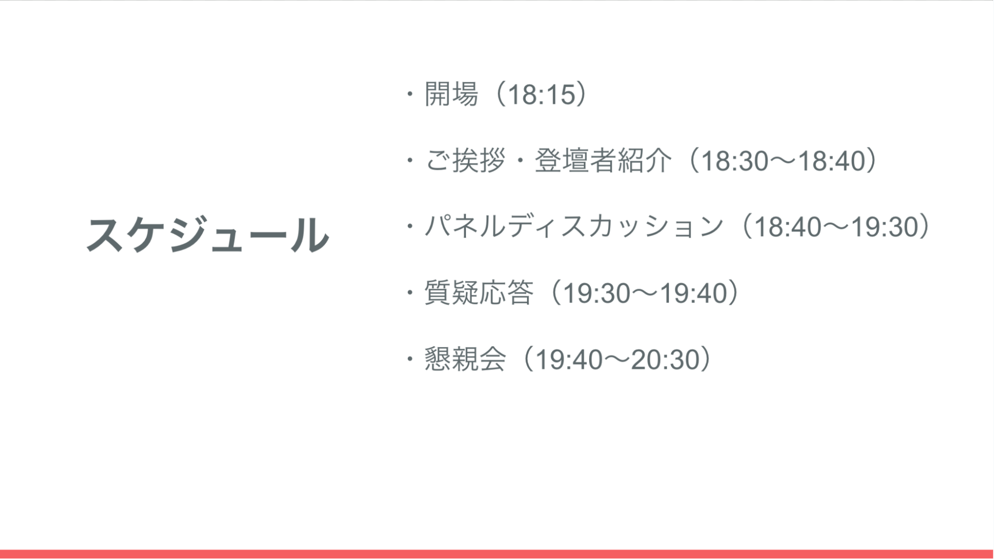 弊社の取締役である坂本から挨拶をした後、今回のイベント開催の目的・背景を説明しました。各社の紹介が終わった後は、早速トークテーマの話になりました。