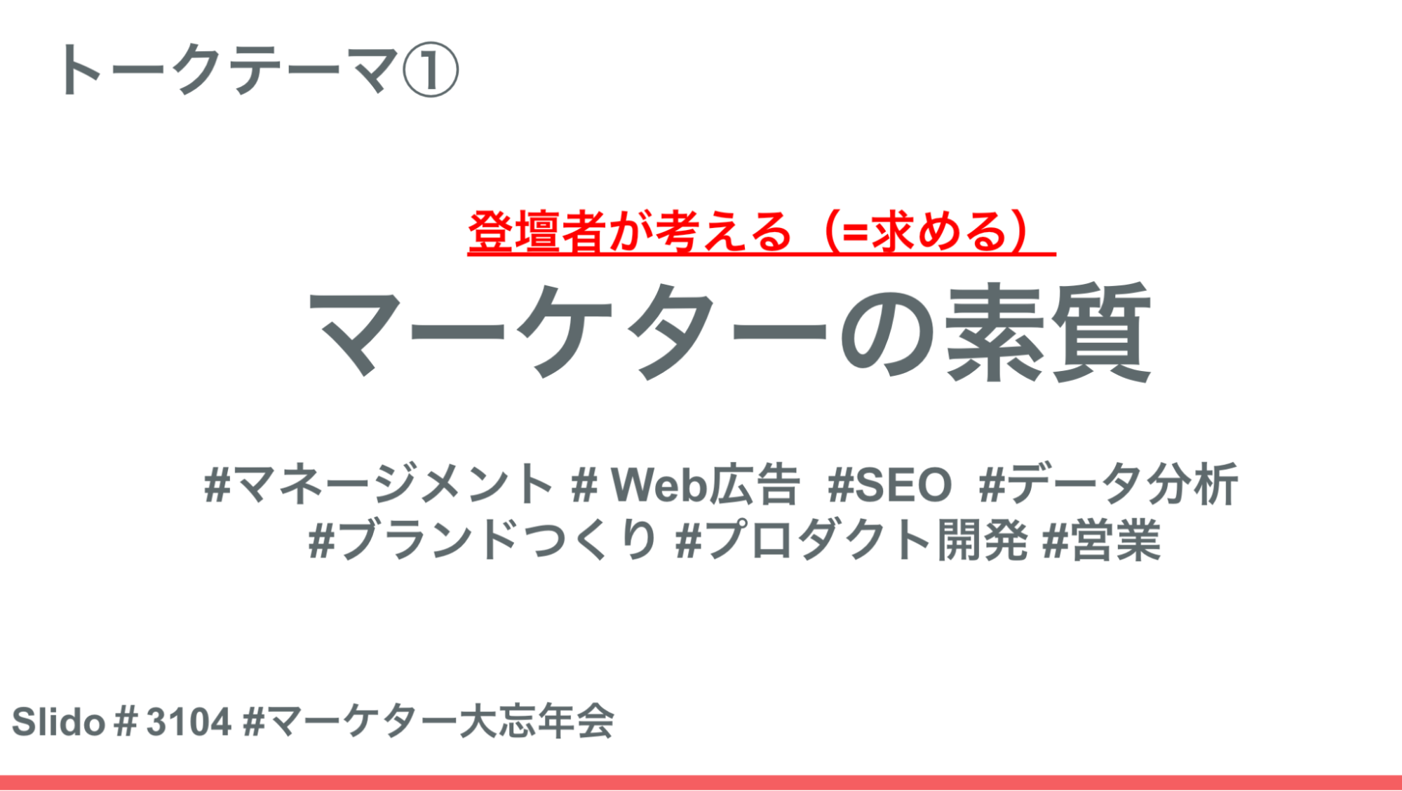 1つ目のテーマでは、各登壇者がマーケターに考える(=求める)素質についてのお話をしていただきました!