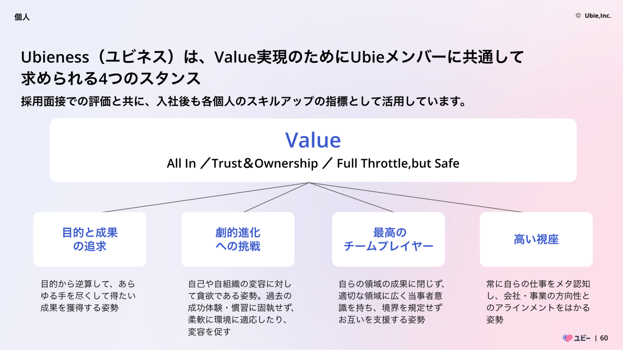 岡さんが考えるマーケターの素質は「企業のミッションに共感して、目的と成果を追求できる人」です。Ubieではスタンスとスキルを言語化しており、スタンスとしては4つ定めており、世界に通用するサービスを作り出すために、個人はもちろんチームで高い視座をもって目的と成果を追求するスタンスを求めています。