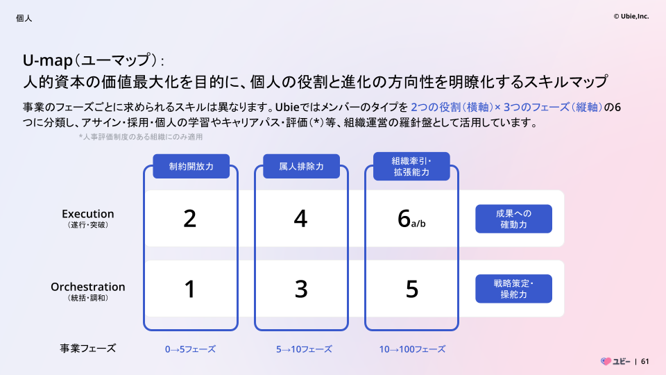 また、U-mapというスキルマップも可視化しています。マーケターに求めるスキルとしては10を100にできるスキルで、プロダクトマーケットフィットしたサービスを世界に届けられるスキルがマーケターに求めるスキルであるとおっしゃっていました。